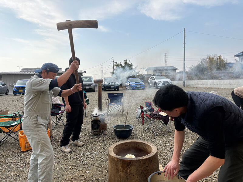 新しい事務所に移り初めての新年、上州名物のからっ風もなく暖かい日に社内全員で餅つきを行いました。